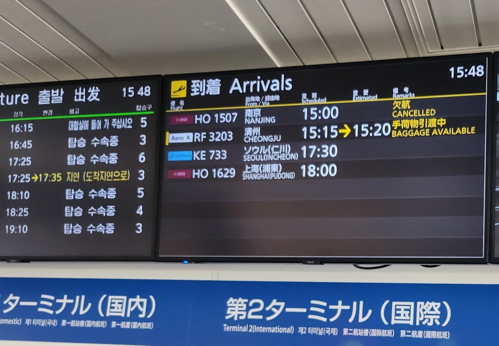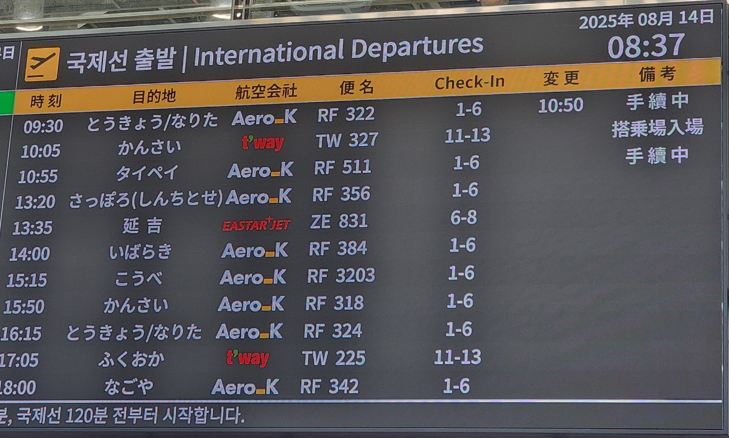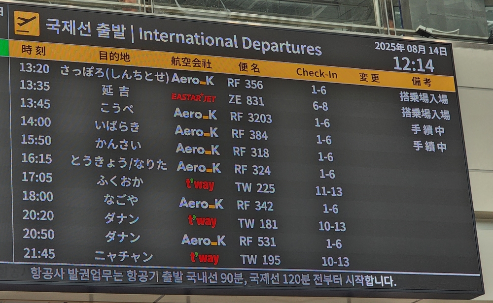 2025年8月14日8:37、韓国・清州国際空港。エアロKのRF3203 清州→神戸便が15:15発として表示されています。