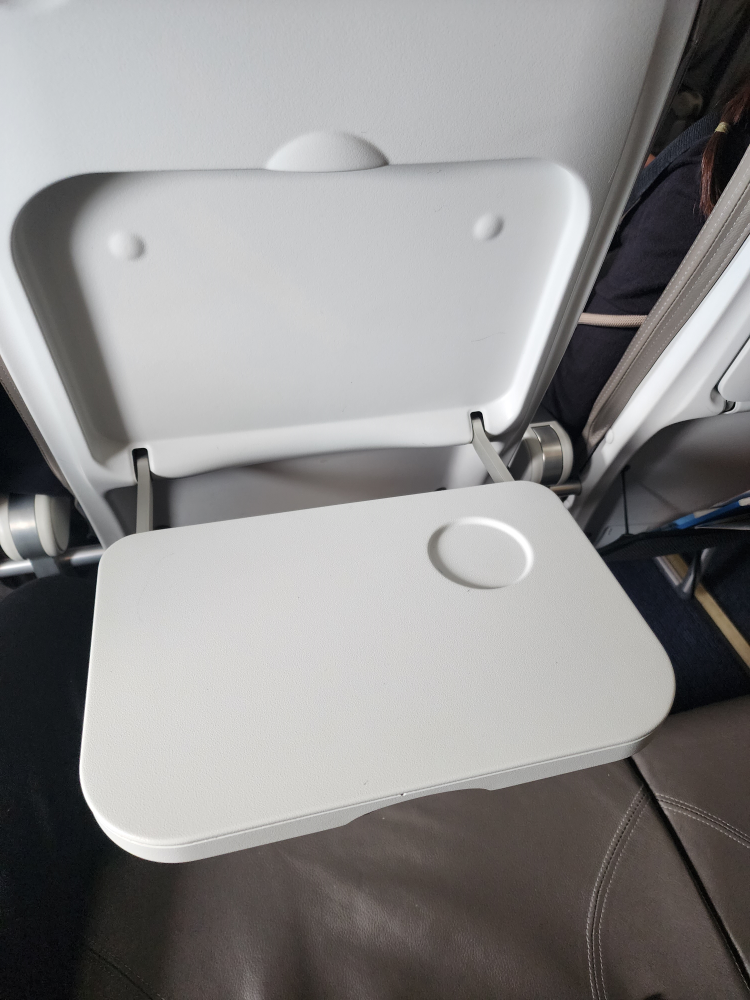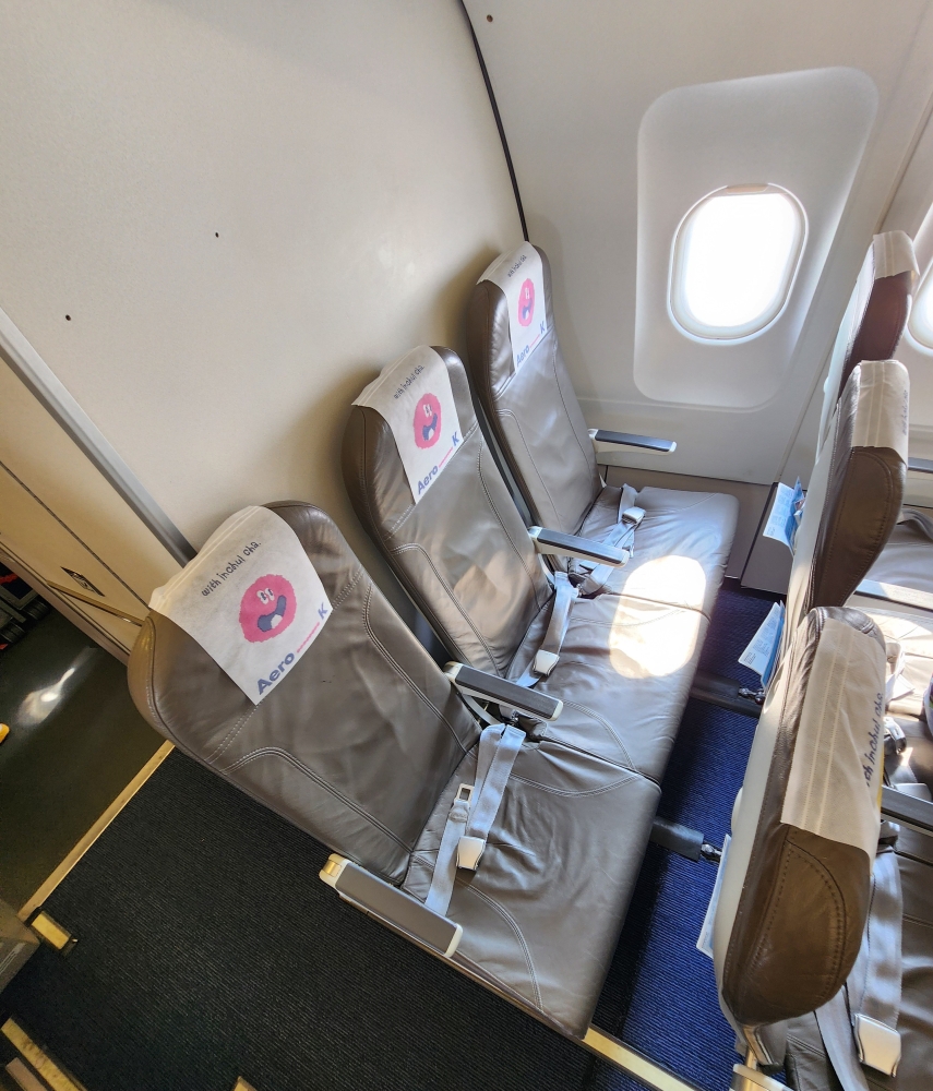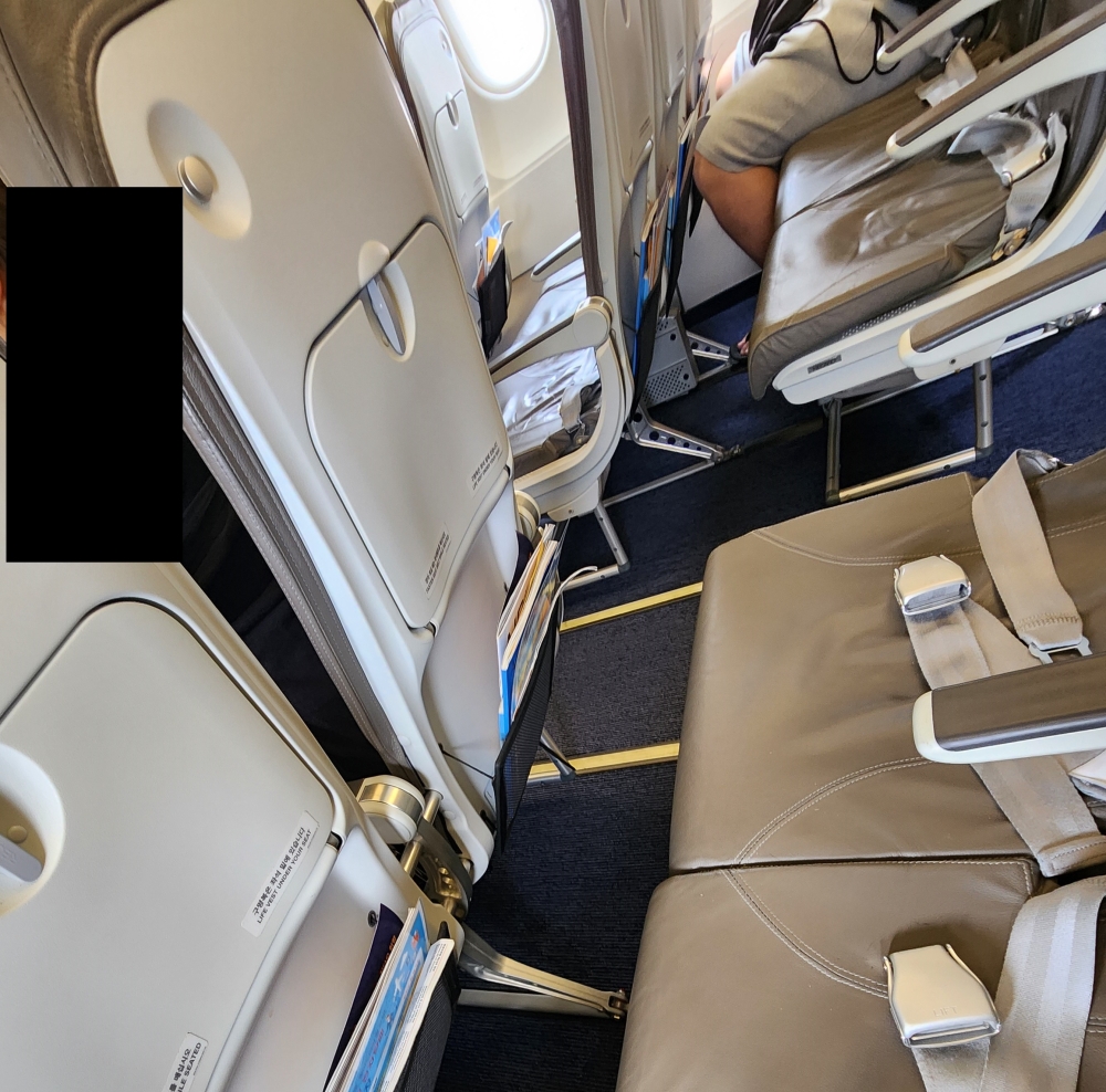 機材はA320(HL8563)。以前に大阪/関西→清州でエアロKに乗ったとき(リンク)と座席の形が違ったので驚きました。シートピッチの狭さが露骨に感じられます。私の座っていた後方席は28インチだったようで、余裕で前の座席に膝が当たります……。隣の座席が空席で助かりました。ちなみにリクライニングはできません。