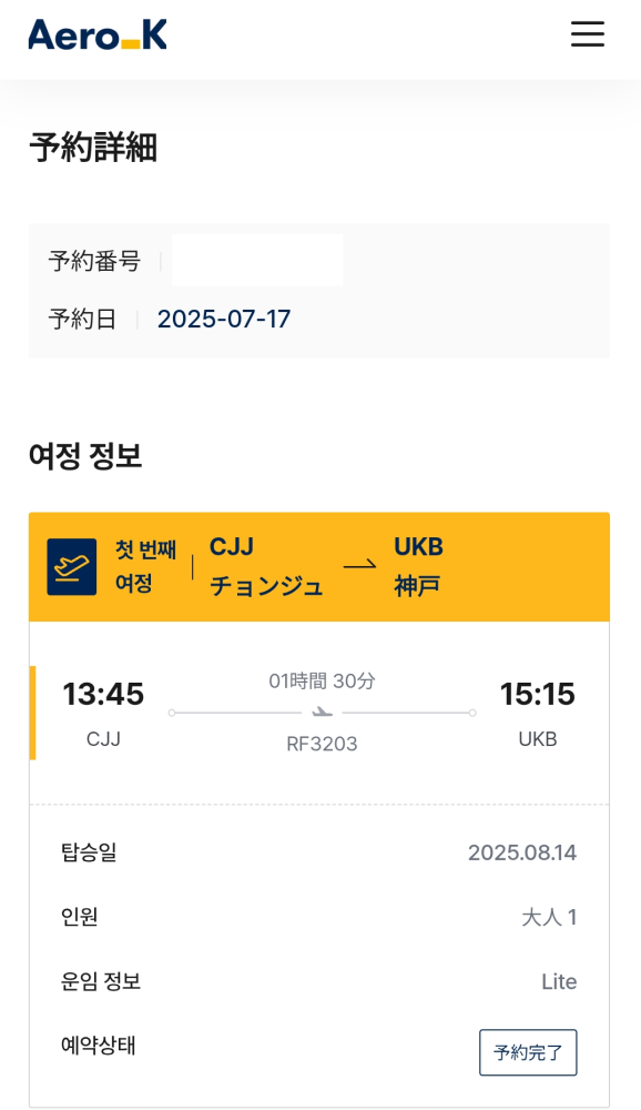 2025年8月に3日間限定で運行された、エアロK 清州(チョンジュ)→神戸 RF3203便の搭乗記です。