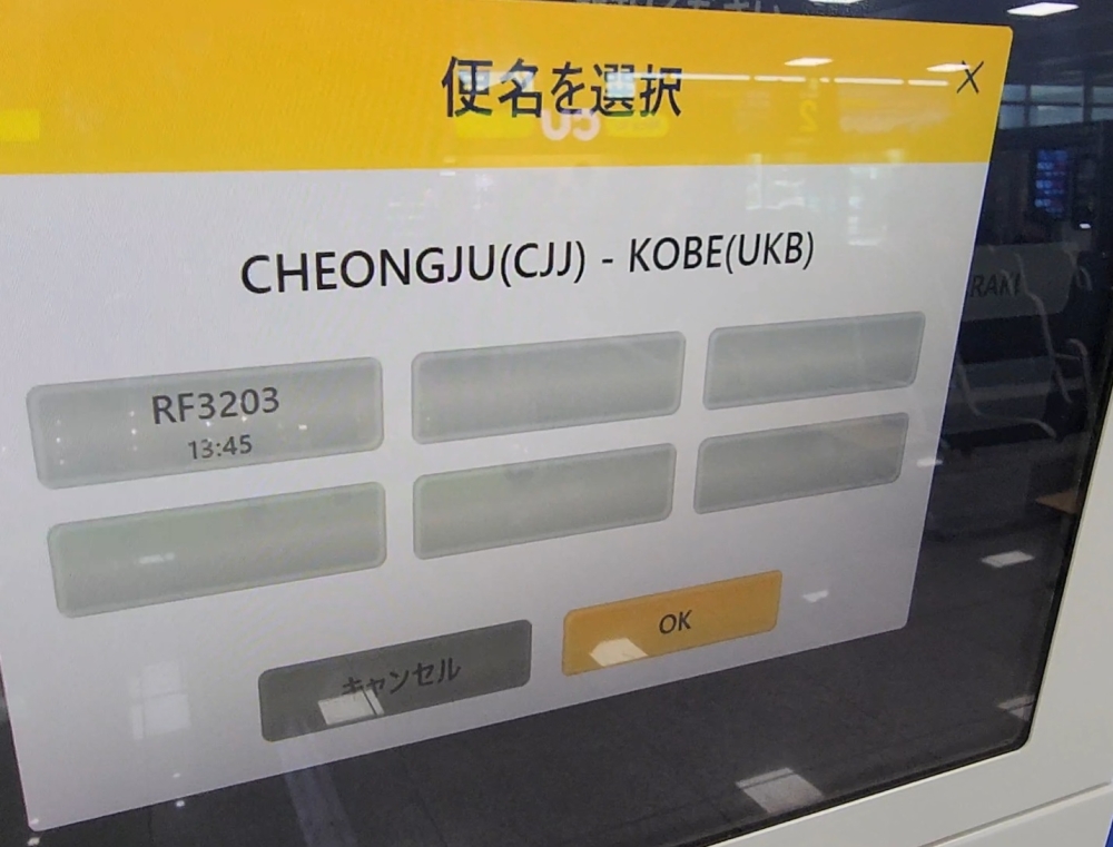 清州国際空港発の国際線で、自動チェックイン機が問題無く使えました。便名選択で神戸を選ぶことができました。